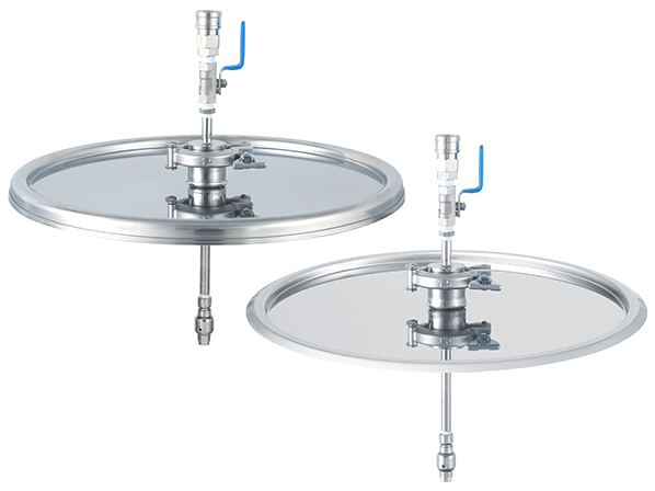 容器内面をシャワー洗浄できる、洗浄ノズルと蓋のセットです。水圧によってシャワーノズルが360°回転し、洗浄液を容器内面に噴射して汚れを落とします。本洗浄前の予備洗浄(予洗い)や、すすぎに最適です。