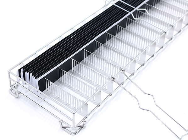バイオ関連メーカー様に納入させていただいた、帯状の薄い特殊フィルムを差し込んで、薬液が入ったバットに浸すために使用する台座です。